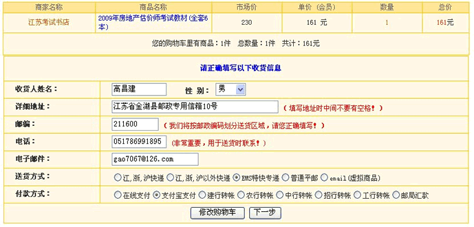 3、填写好收货信息,选择送货方式,付款方式后,点击“下一步”